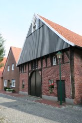 Das Ackerbürgerhaus an der Rekener Straße ist mit seinem grünen Tennentor typisch für das frühe Wohnen und Arbeiten im Münsterland. Wohn- und Wirtschaftsteil befanden sich unter einem Dach.